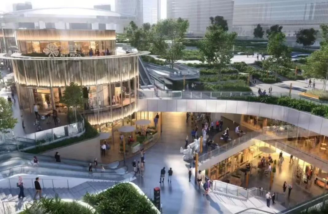 其次,打造公園+商業(yè)的模式,將休閑游憩功能與購物娛樂功能相結(jié)合,滿足消費(fèi)者更多情緒共鳴的需求,如中關(guān)村ART PARK設(shè)計(jì)了若干下沉廣場,將地下空間向城市和公園界面開放,打造具有生態(tài)層次感三首層空間規(guī)劃;