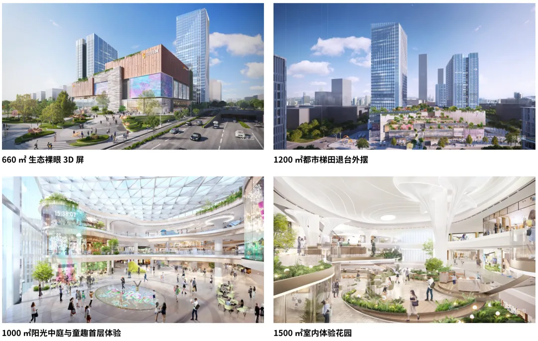 項(xiàng)目設(shè)計(jì)了若干下沉廣場,將地下空間向城市和公園界面開放,打造具有生態(tài)層次感的庭院-花園-公園,從而實(shí)現(xiàn)地下-地面-屋頂?shù)娜讓涌臻g規(guī)劃。不僅給到了項(xiàng)目和品牌乃至這個(gè)城市更多的場景敘事和想象空間,同時(shí)也給消費(fèi)者帶來了更多更豐富的社交空間、沉浸體驗(yàn)空間,最終打造了一個(gè)完美的生態(tài)場域。