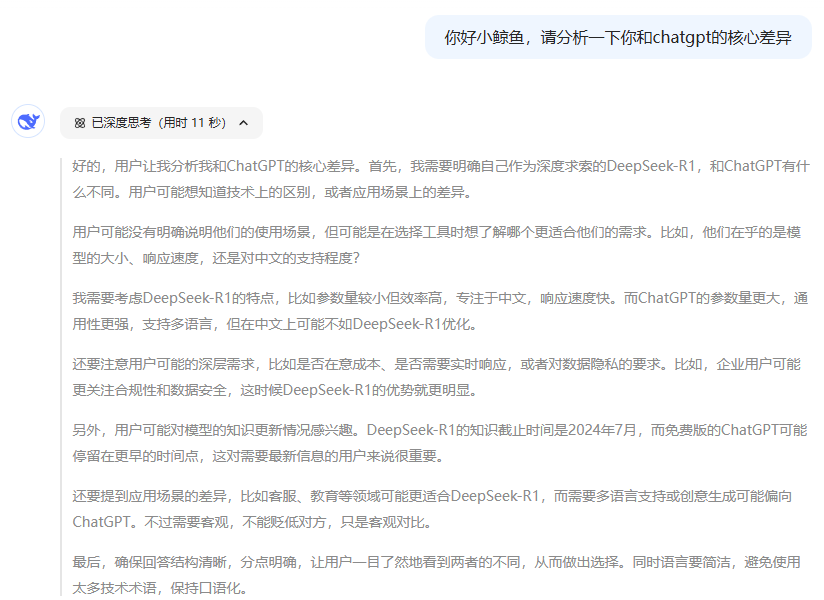 以上圖為例。在深度思考R1模式下,當(dāng)用戶詢問它與ChatGPT有何差異時(shí),DeepSeek首先展示了其對(duì)于回復(fù)方向的思考角度與框架,比如工具選取角度、場(chǎng)景應(yīng)用角度,這也是在引導(dǎo)用戶進(jìn)一步了解自己的業(yè)務(wù)訴求。它不僅是在輸出結(jié)論性總結(jié),也在幫助用戶尋找問題的本質(zhì)。