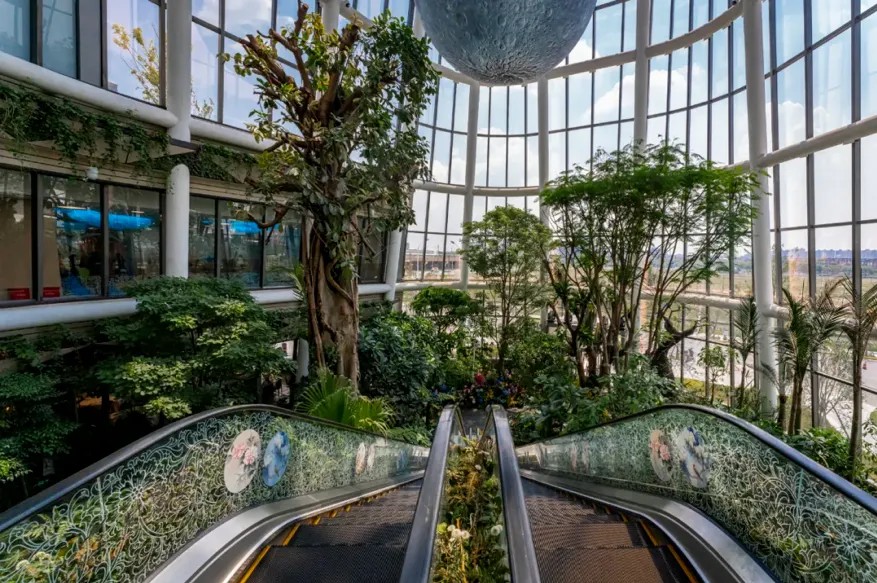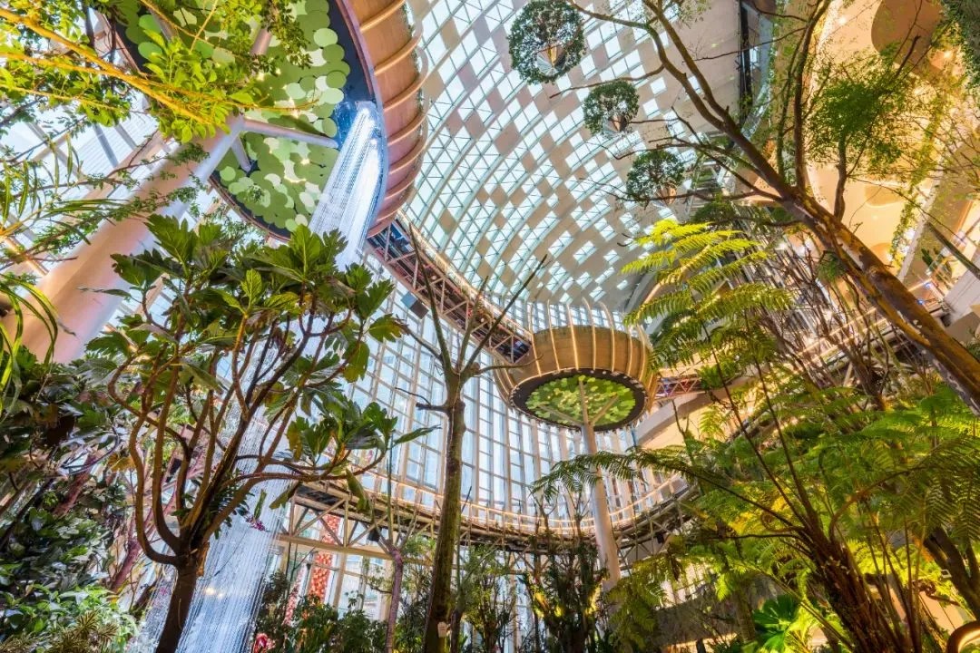 以“一日微度假勝地”為定位的上海南翔印象城MEGA,不僅融合了多元業(yè)態(tài),還巧妙地融入了植物園等自然生態(tài)元素。在建筑設(shè)計(jì)上,其外立面以“梯田山丘”為靈感,打造出上海罕見(jiàn)的退臺(tái)花園;在商場(chǎng)內(nèi)部,創(chuàng)造性地引入了森林、濕地等自然景觀,構(gòu)筑了一座占地約600平方米、高達(dá)5層、擁有200多種國(guó)內(nèi)外植物的跨層生態(tài)植物園。